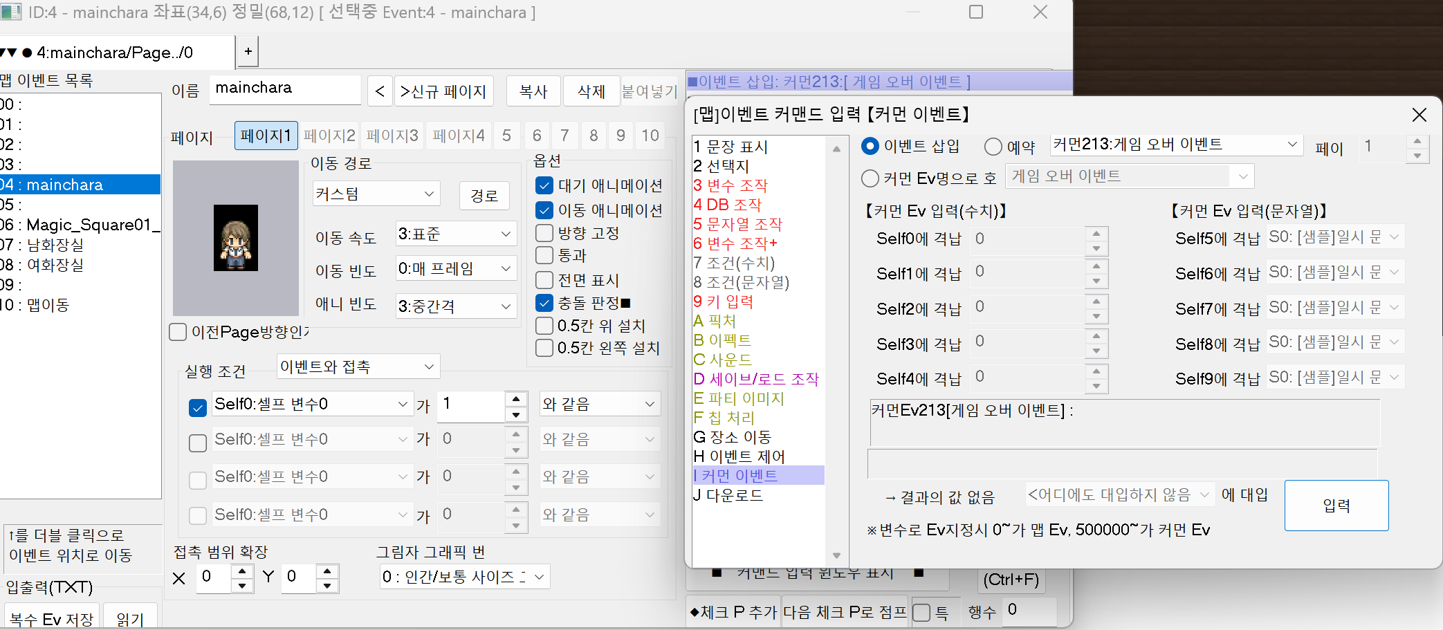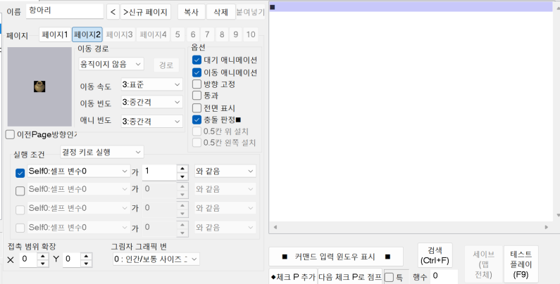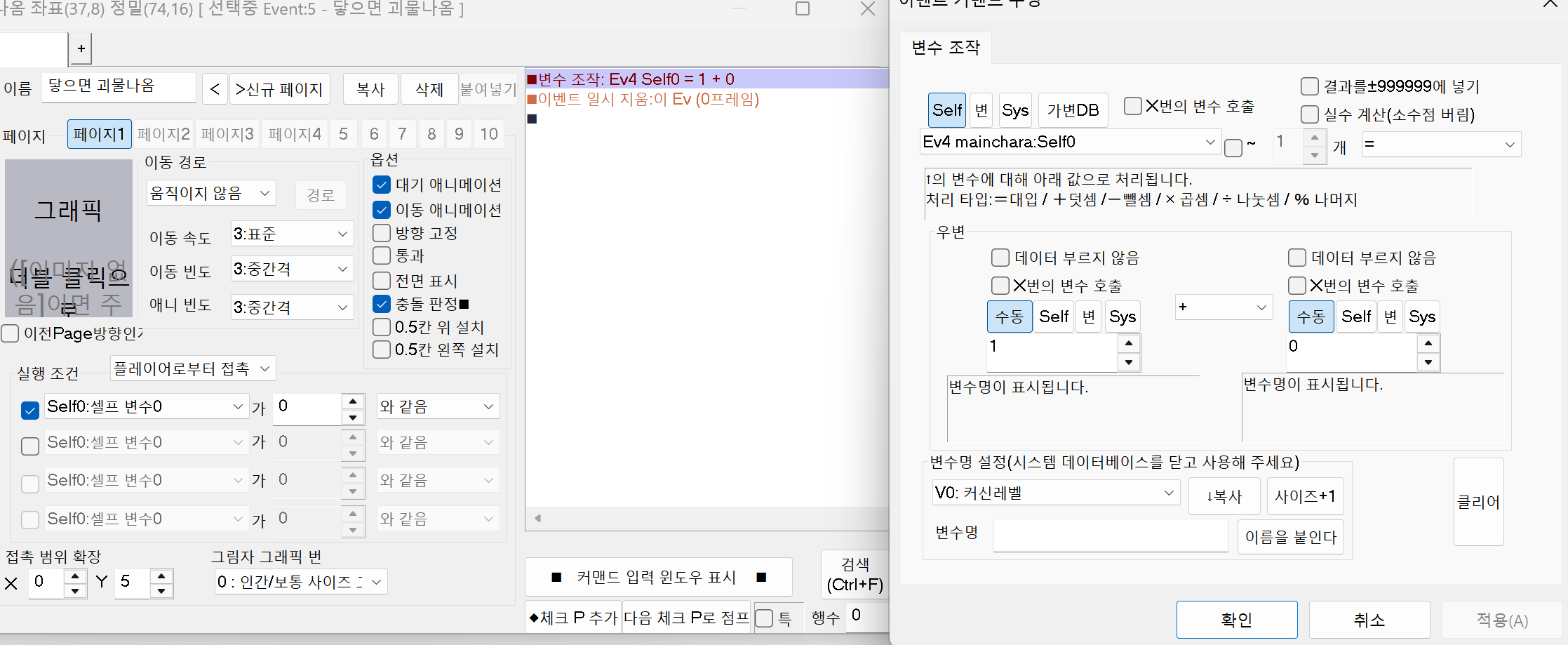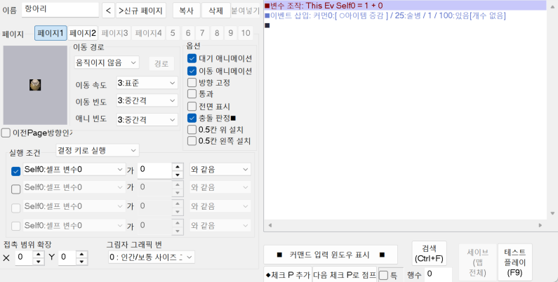 실행 조건의 셀프 변수를 0으로 체크해 주고 변수 조작에서 이 이벤트의 셀프 변수를 +1 합니다.