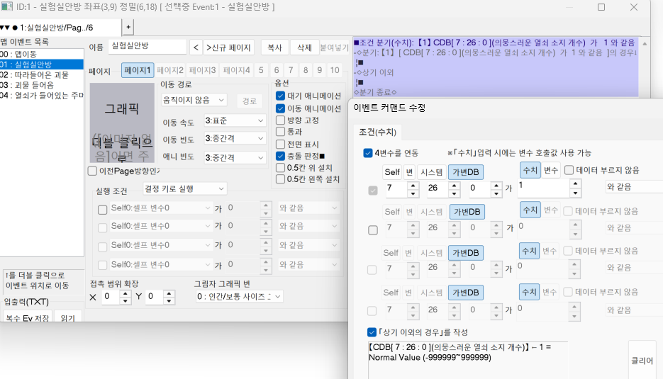 가변 DB 7번(소지 아이템 개수)의 26번 아이템(열쇠)이 1개 있을 때 조건이 성립한다는 뜻입니다.